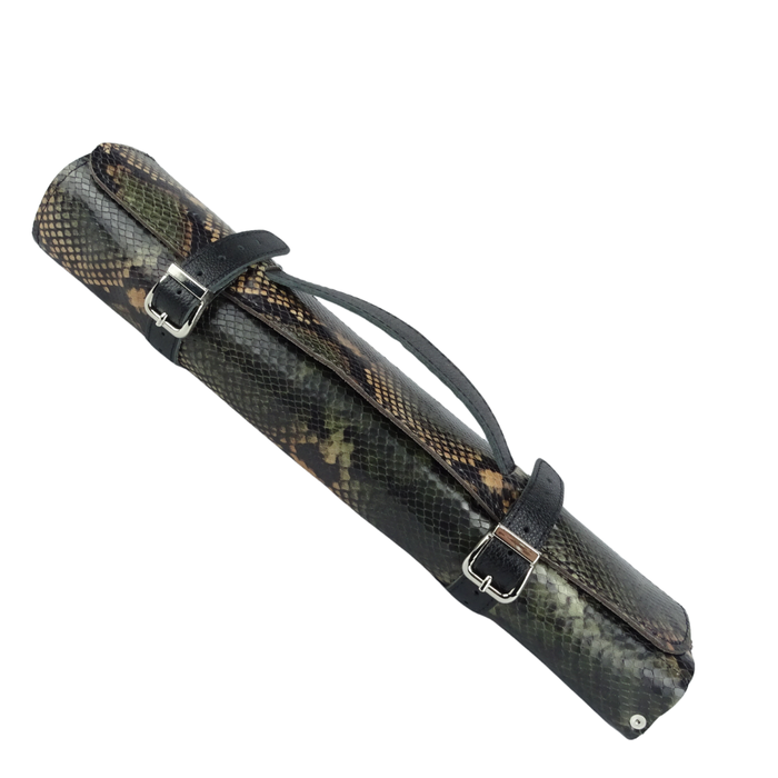 Com 40 cm de comprimento por 42 cm de largura quando aberto, o estojo para facas de couro oferece espaço para até 5 facas ou utensílios de até 36 cm, incluindo cabo e lâmina. Fabricado com couro legítimo, o estojo possui fechamento em fivelas robustas e uma textura que imita pele de cobra verde, unindo funcionalidade e sofisticação em um só produto.