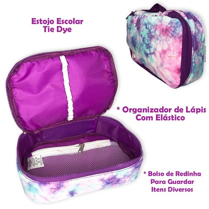 Estojo Escolar Quadrado Grande Feminino Tie Dye Roxa Rocie