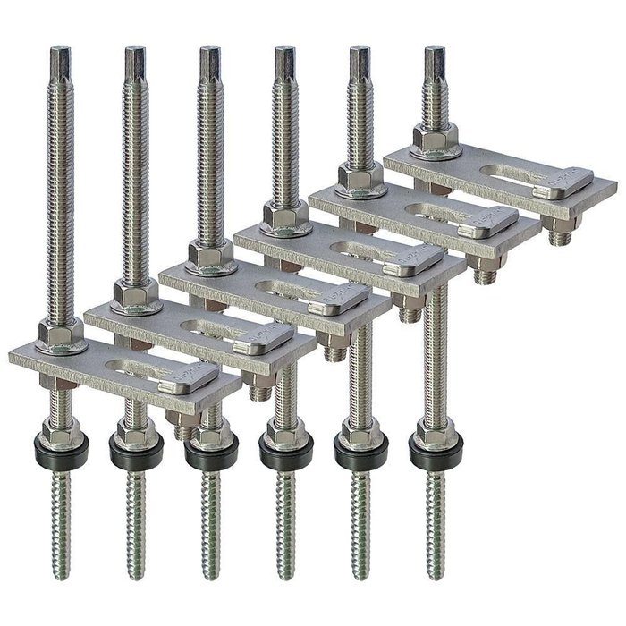 Este suporte para painel solar é fabricado em aço inoxidável e alumínio, perfeito para suportar todos os tipos de clima, graças a sua durabilidade e alta qualidade. Escolha ideal devido ao ótimo custo X benefício, pois a fixação é feita direto na estrutura de madeira do telhado, e para vários tipos de telhas, não tendo necessidade de outros suportes ou de reforma. Também é indicado para todos os tipos de regiões, graças a seus materiais não ferrosos, podendo suportar, até mesmo, a maresia dos litorais. Além disso, possui dois reguladores de altura, podendo se adaptar a todos tipos de telha, garantindo ótimo nivelamento para suas placas.Esse Kit Contém:- 6 Parafusos com Rosca Dupla em Aço Inox: M8x250mm;