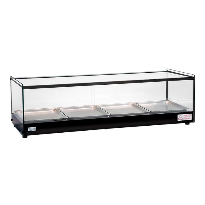 A Estufa Erato LP 4B - Self Service - Perfil Preto - Titã traz a abertura em vidro deslizante pela frente, além do LED que proporciona o destaque ideal aos alimentos a serem expostos em duas bandejas padrão G/N