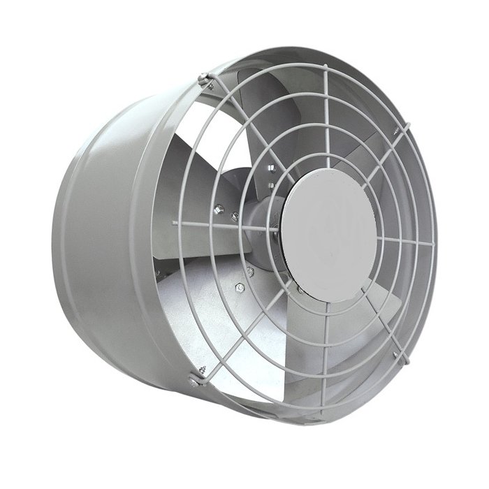 O exaustor axial EQ300T4 é fabricado com carcaça de construção robusta em chapa de aço carbono, pintados em epóxi, com diâmetro de 300mm, hélice metálica e motor IP 54