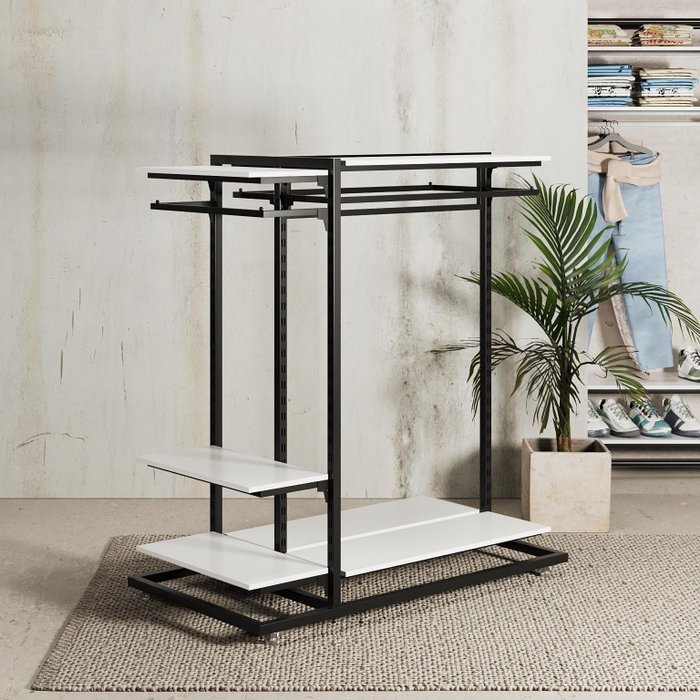 Com 130cm de largura, 150cm de altura com os rodizios e 70cm de profundidade, este expositor é fabricado em aço carbono, garantindo durabilidade e resistência. Disponível nas cores branco e preto ele se adapta facilmente à estética da sua loja.