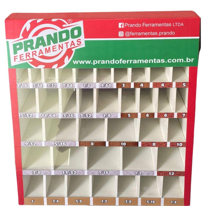 Expositor de Brocas Prando Produzido em MDF e Frente de Acrilico (Evitando assim ressecamento proveniente do ácido das brocas) O expositor é alto didático Permite ao vendedor identificar com facilidade o tipo de broca que o cliente precisa. Com tranca e chave inclusa Com tabela de conversão polegadas / milímetros Com tabela de preços.