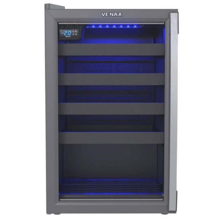 - Destaque suas bebidas com estilo e sofisticação! A Expositora Champanheira Venax 100L une funcionalidade e design premium: porta invertida grafite, iluminação LED azul para um visual elegante e controlador digital de temperatura que garante a conservação perfeita.