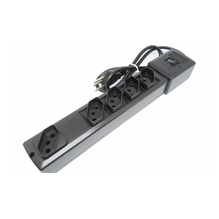 Filtro de linha Bivolt com 4 tomadas com proteção contra sobrecargas, interruptor liga/desliga, LED indicador de funcionamento e sistema de fixação.