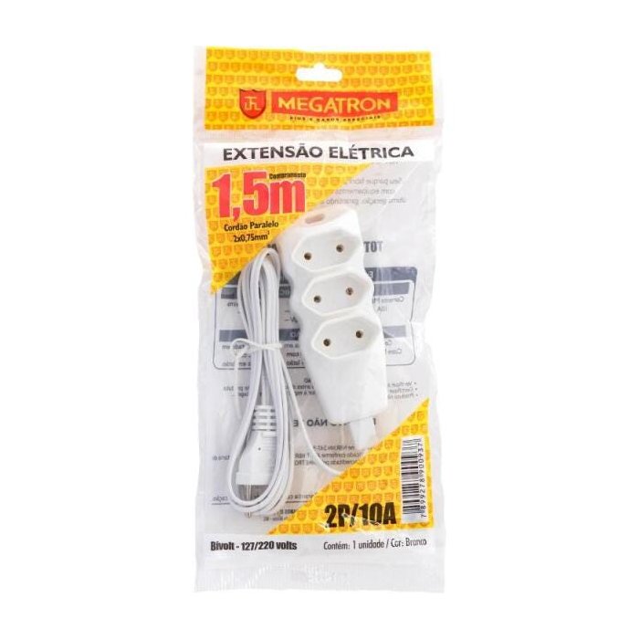 Extensao Eletrica Megatron 3 Tomadas 1,5mt 2x0,75 Cordao Paralelo Branca