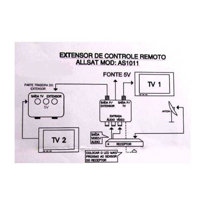 O Extensor Modulado de Controle Remoto AllSat-1011 é para decoders que não tenha a saída Rf Out ou Tv Out, ele transforma a saída Rca do decoder em Rf modulado no canal 3 e envia o sinal via cabo coaxial para um segundo ponto (neste cabo vai trafegar áudio, vídeo e o sinal do controle remoto).