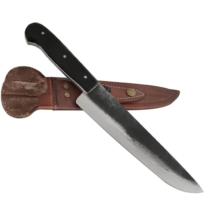 Faca 8' Paineira do Coqueiro Deitado Artesanal Churrasco Campeira Cabo Chifre Bainha Couro. #Têmpera preparada para receber impactos #Tamanho ideal para churrasco #Faca feita artesanalmente Garantia: 3 meses / Peso: 314g / Cor: Chifre mesclado / Ref: TRADCARBCF08 Dimensões da faca: 31cm (C) x 1,5cm (L) x 4,5cm (A) Dimensões do cabo: 11cm (C) x 2cm (L) x 3cm (A) Dimensões da lâmina: 20cm (C) x 2,65mm (Espessura) x 4,5cm (A) Dimensões da bainha: 26cm (C) x 1,5cm (L) x 8cm (A) Polegadas: 8\" Lâmina: com tratamento térmico (têmpera) de excelente qualidade, propiciando para a faca maior resistência mecânica e durabilidade de fio. Full Tang (monobloco), que se estende inteiramente até o final do cabo e com acabamento brut forge, onde é mantido o aspecto original que se tem do aço saído da forja em parte da lâmina. Limpeza e conservação: Para maior conservação, orientamos que após o uso, a sua faca seja higienizada e bem seca, minimizando com isso, a oxidação agressiva (que não é prejudicial a saúde) e manchas na lâmina. A oxidação é um processo normal do aço carbono, ela será minimizada facilmente utilizando o lado mais abrasivo (grosso) de uma esponja. Também pode ser utilizado um pouco de azeite de oliva, vaselina sólida ou WD40 após a higienização. Afiação: Para melhor conservação do fio de sua faca, orientamos o uso de uma chaira, mantendo o alinhamento e prolongando o poder de corte, quando for necessário, pode ser utilizado uma pedra ou lixa d'água com o grão bem fino. *As tonalidades e cores dos cabos variam de uma peça para outra por se tratar de uma faca artesanal com cabo de chifre natural. Cada peça é única e exclusiva, ninguém terá uma igual a sua. Material lâmina: - Aço Carbono 1070: A lâmina é temperada a óleo em um processo bem artesanal. Possui grande resistência e mantém o fio por muito tempo. Por ser aço carbono, é um material que enferruja com facilidade, porém, a oxidação não interfere no fio. Para melhor conservação visual é necessário seguir os cuidados indicados a cima. Material do cabo: - Chifre; - Enchimento de vinil. Material da bainha: - Couro. Faca paineira do coqueiro deitado modelo antiga, com 8 polegadas e 4,5cm de largura de lâmina, é uma faca larga estilo picanheira. Ideal para usos em geral, no campo, com carnes e no churrasco. Feita artesanalmente, com cabo de chifre e cores lindas que se misturam ao natural. Possui lâmina com 2,65mm de espessura, em modelo full tang, onde a lâmina se estende inteiramente até o final do cabo. O acabamento é rústico e a faca é uma peça robusta. Possui bainha em couro que entrega segurança no transporte.