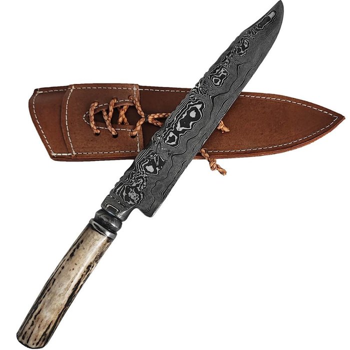 Faca Artesanal Forjada Aço Damasco Integral 8' Cabo Chifre de Cervo Churrasco