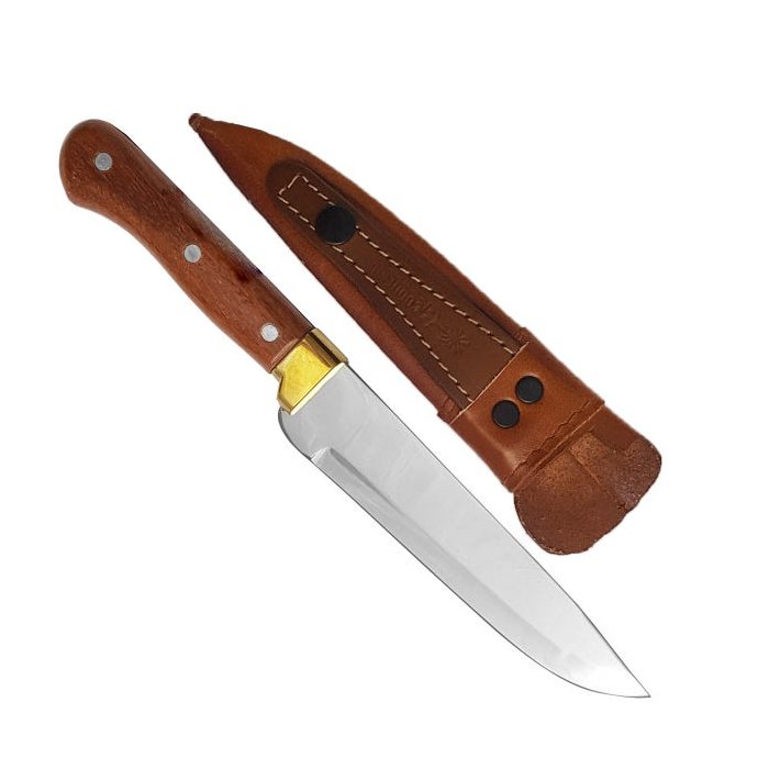 Faca de churrasco tradicional de produção artesanal. Sua lâmina em aço inox 420 de 7 polegadas da à peça um corte mais que especial. É uma peça forte, perfeita para usos práticos em geral. Com cabo de madeira, material resistente e nobre, é uma faca que vai impressionar, não só pela beleza, mas pelo equilíbrio e facilidade de uso. Acompanha bainha em couro para transporte que possibilita carregá-la no cinto, tornando o seu deslocamento ainda mais fácil e seguro.