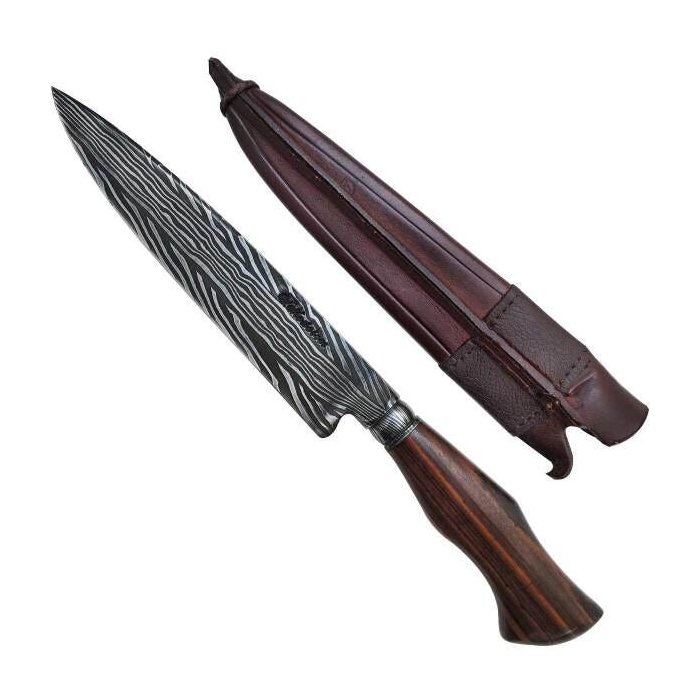 Faca de Aço Damasco totalmente artesanal, feita com padrão mosaico é uma faca diferenciada que exige do cuteleiro maior capricho em sua forja. Feita com 120 camadas de dois tipos diferentes de aço, torna a lâmina robusta e com fio duradouro. Diferente das facas de aço damasco tradicionais, as padrões mosaico são mais difíceis de serem forjadas e permitem uma quantidade menor de camadas, deixando a peça com beleza e corte incomparável. Com 8 polegadas possui tamanho e peso ideal para o manuseio. Por ser feita em aço damasco, é uma faca única, ninguém terá uma igual a sua.