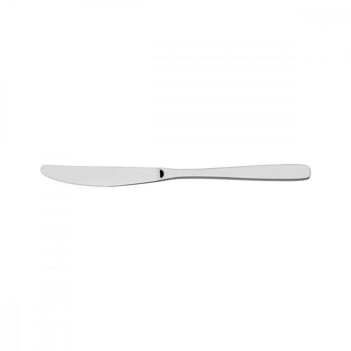 Faca totalmente temperada, que garante maior durabilidade no fio de corte e maior resistência à corrosão, e por sua característica de temperabilidade, não risca as porcelanas. Totalmente feita de aço inox, mantém suas características , preservando a beleza, a higiene e a durabilidade do material. Acabamento em brilho.Própria para diário combina com qualquer ambiente. Pode ser lavada diariamente na máquina de lavar louças.