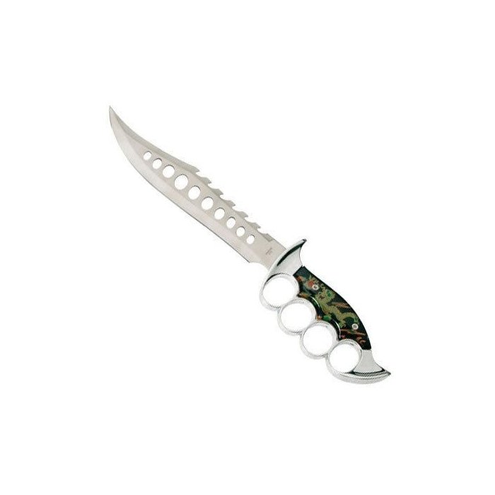Faca esportiva com soco inglês Western FE95 Faca ideal para camping, caça e pesca Lâmina resistente e com ótimo corte Acompanha bainha com passante para cinto Cabo decorado Lâmina especial com furos Tamanho do produto: 37cm x 7cm x 1,7cm Tamanho da lâmina: 9 Polegadas (23cm)