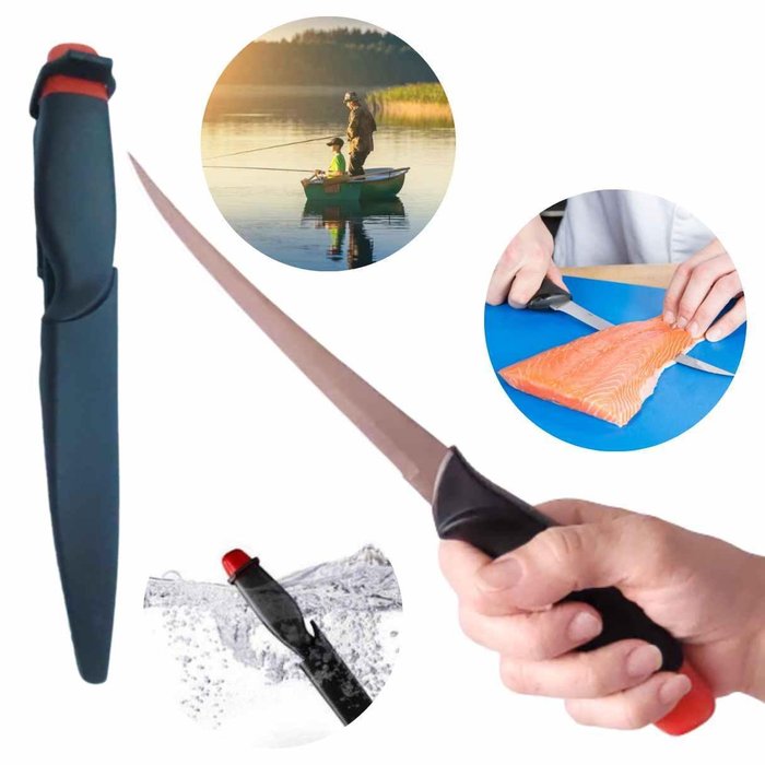 Faca fileteira para pesca com lâmina extremamente afiada e com desenho próprio para a função, cabo anatômico e oco o que faz ela flutuar, lâmina confeccionada em aço inoxidável ideal para pesca, camping e churrasco.