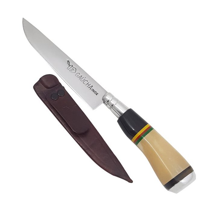 Faca Gaúcha 5" Inox Cabo Osso e Chifre com Bainha de Couro Inox, Marrom, Bege, Preto Amarelo, Verde, Vermelho