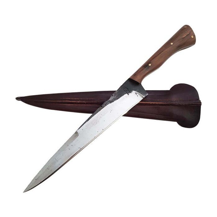 Faca Gaúcha Estreita Lâminada totalmente artesanal sendo única e exclusiva. Ninguém terá uma igual a sua. Robusta e com a lâmina monobloco (full tang), que se estende inteiramente até o final do cabo, a faca para churrasco é resistente, possui excelente corte e ótima retenção de fio. Com acabamento brut forj, a lâmina mantém em parte o seu aspecto bruto e original que se tem do aço recém-saído da forja. Por conta disto, cada faca é única e pode possuir variações.