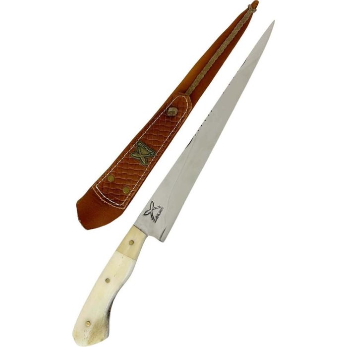 Faca Língua de Chimango 12' Inox 420c 4mm Cabo Osso Full Tang Zanline Bainha Couro Branco