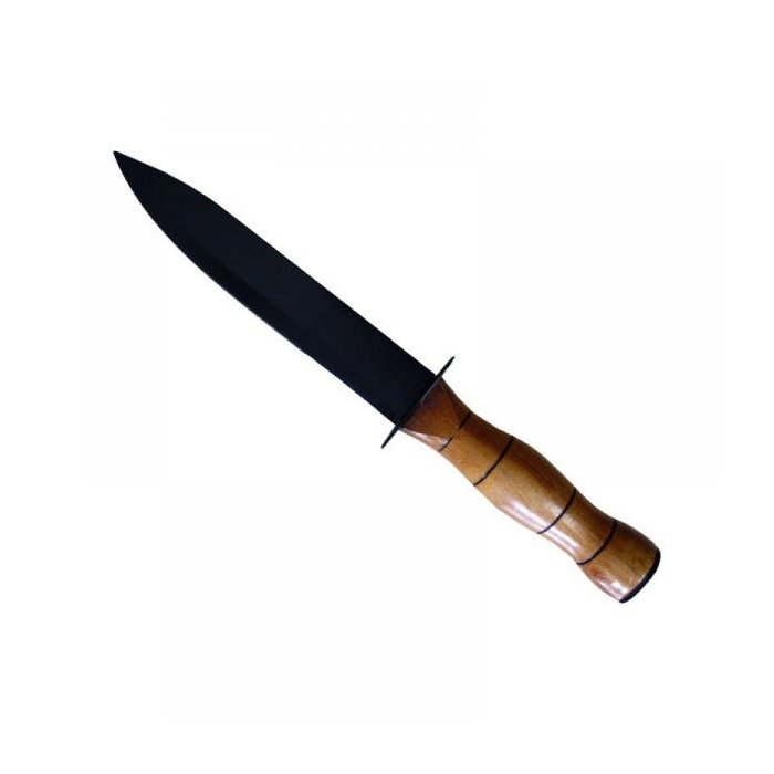 Faca MK2 Bélica, produzida em aço carbono 1045, com cabo de madeira envernizada e bainha em polímetro.