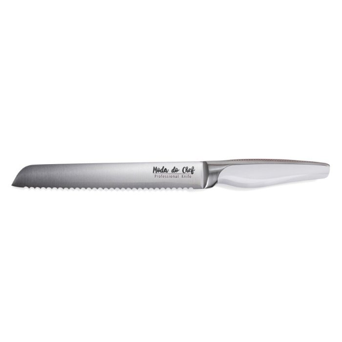 A Faca para Pão Exclusiva Moda do Chef é uma faca feita para cortar de forma muito mais precisa, prática e rápida, permitindo trazer muito mais beleza ao pão, sem que as suas partes sejam destruídas e as texturas se mantenham intactas. Com oito polegadas de comprimento, sua outra grande vantagem é a lâmina fina e longa, a qualidade do material e a tecnologia envolvida na produção. Além da Faca para Pão Exclusiva Moda do Chef, a Moda do Chef conta com mais quatro modelos diferentes: faca do chef, para filé, frutas e legumes!