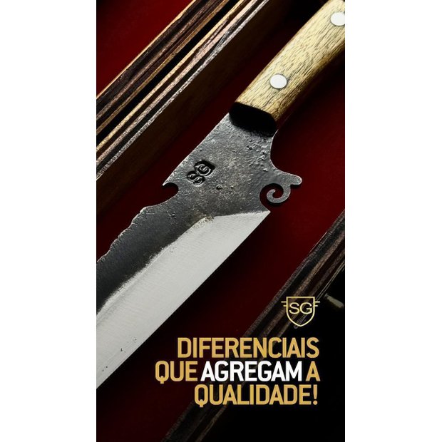 Especificações técnicasLâmina em aço carbono 1070 com tratamento térmicoEspessura de 3 mmTamanho da lâmina de 6 polegadas (15,2 cm)Comprimento total aproximado de 27 cmAcabamento bruto artesanalCabo em madeira natural com encaixe ergonômicoAcompanha caixa de madeira com interior forradoProdução artesanal nacional