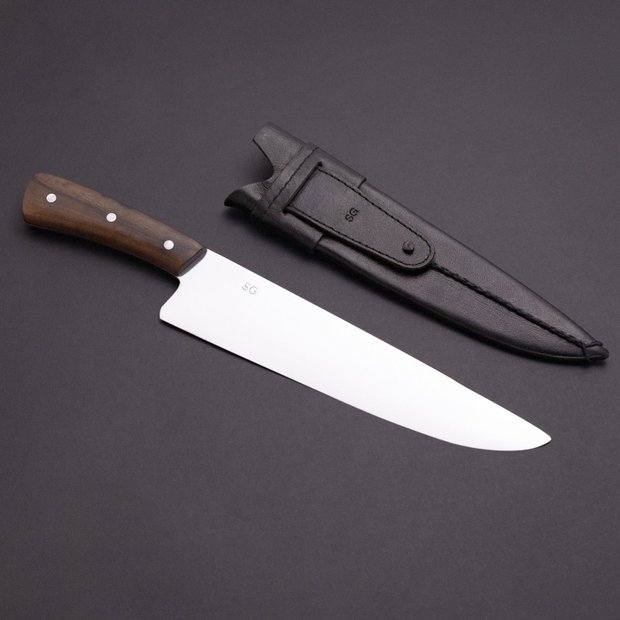 A Picanheira Prime SG foi desenvolvida para quem busca cortes imponentes, precisos e com estilo. Com lâmina larga e espessura equilibrada, oferece excelente desempenho no preparo de carnes, principalmente em churrascos. Seu cabo em madeira de Imbuia, no estilo Full Tang, proporciona firmeza, conforto e durabilidade, enquanto a bainha em couro legítimo reforça a tradição artesanal da cutelaria SG.