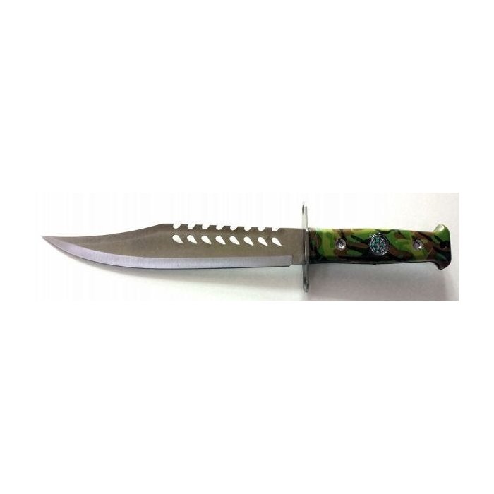 Faca Sobrevivência com Bússola Faca com um design primordial. Indispensável para quem faz camping, pescaria, trilha, escalada e etc... Faca multiuso. Possui serrilhado no dorso da faca. Bússola no cabo Lâmina fulltang. Acompanha bainha Cabo parafusado. Medidas aproximadas: Espessura da lâmina: 3 mm Lâmina: 21 cm Cabo: 12 cm