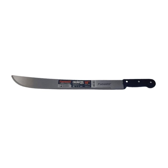 Facão Mato Cabo Plástico 18" - Famastil O Facão Mato Cabo Plástico 18" - Famastil tem desenho ergonômico, facilitando e deixando confortável o uso. As lâminas são polidas e temperadas, o que resulta em maior durabilidade do fio, devido ao tratamento térmico. Para garantir a durabilidade dos produtos, recomenda-se secá-los bem após a lavagem. Características: • Lâmina até o final do cabo • Lâmina polida e temperada Medidas: Comprimento: 58cm Comprimento lâmina área de corte: 45cm Comprimento Cabo: 13cm Largura: 5cm Altura: 2cm Peso: 0,391kg Marca: Famastil Garantia: 3 meses