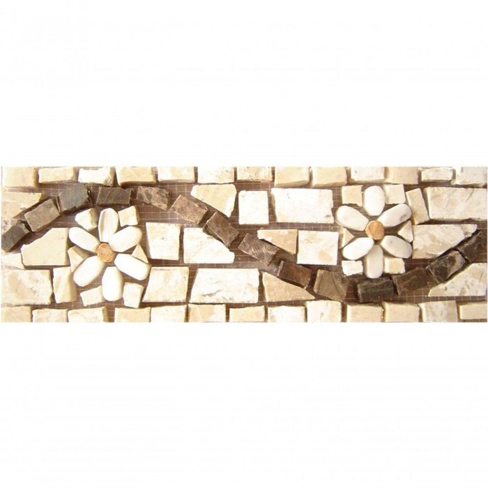 Tamanho 10cm x 30cmCores: Faixa decorativa com margaridas brancas e fundo travertino bege, entre as mais pedidas. Especificações técnicas do mosaico: Feito com pedras - Mármores e granitos de todo o Brasil e importados da Europa e Ásia - para obter todas as cores desejadas em pedras naturais; Vem todo montado sobre tela, só colocar conforme manual de colocação, Resistência e Durabilidade em área interna e externa; Espessura de 10 mm – Mesma espessura do porcelanato ou piso cerâmico Liso e agradável para uso diário; Mosaico feito integralmente à mão com técnica do mosaico romano;