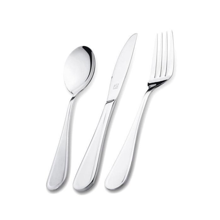 Contém: 12 Colheres de mesa / 12 Garfos de mesa / 12 Faca de mesa / 12 Colheres de sobremesa / 12 Garfos de sobremesa / 12 Facas de sobremesa / 12 Colheres de chá / 12 Colheres de café / 1 Colher de salada / 1 Garfo de salada / 1 Concha / 1 Colher de arroz / 1 Colher de açúcar