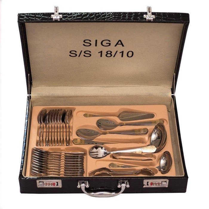 Kit faqueiro alemão aço cirúrgico 84 peças características 12 garfos grandes 12 garfos de sobremesa 12 colheres grandes 12 colheres de sobremesa 12 colheres de café ou chá 12 facas 02 garfo para carne 02 colher de porção 01 concha de sopa 01 pinça para açúcar 01 colher de açúcar 01 garfo para salada 01 colher de salada 01 colher de creme 01 pá para bolo 01 colher de molho belíssimos detalhes trabalhados nas bordas em alto relevo. Conjunto de talheres design alemão, que serve 12 pessoas, todas as peças com detalhes em dourado. Os talheres está entre uma das mais belas linha , dando um charme todo especial a ocasiões como almoços e jantares. As facas são temperadas, evitando riscos em pratos de porcelana. A praticidade e o estilo se aliam para facilitar sua vida na cozinha. Para conservar seu faqueiro, ele vem em uma maleta com espaço para cada peça. Acompanha maleta de couro e código com trava.