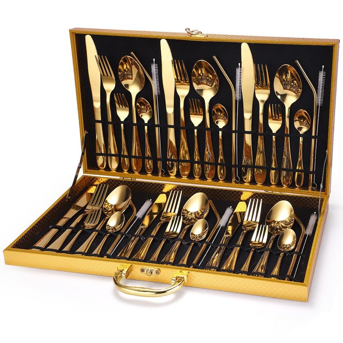 Todas as peças são produzidas em aço inoxidável. Apresentam espessura de 2,5mm, acabamento espelhado em dourado. Caixa estilo maleta reforçada com fechamento.