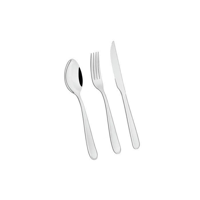 Contém: 06 Colher de mesa, 06 Colher para café, 06 Colher para chá, 06 Faca para churrasco, 06 Garfo de mesa, 06 Garfo para torta.