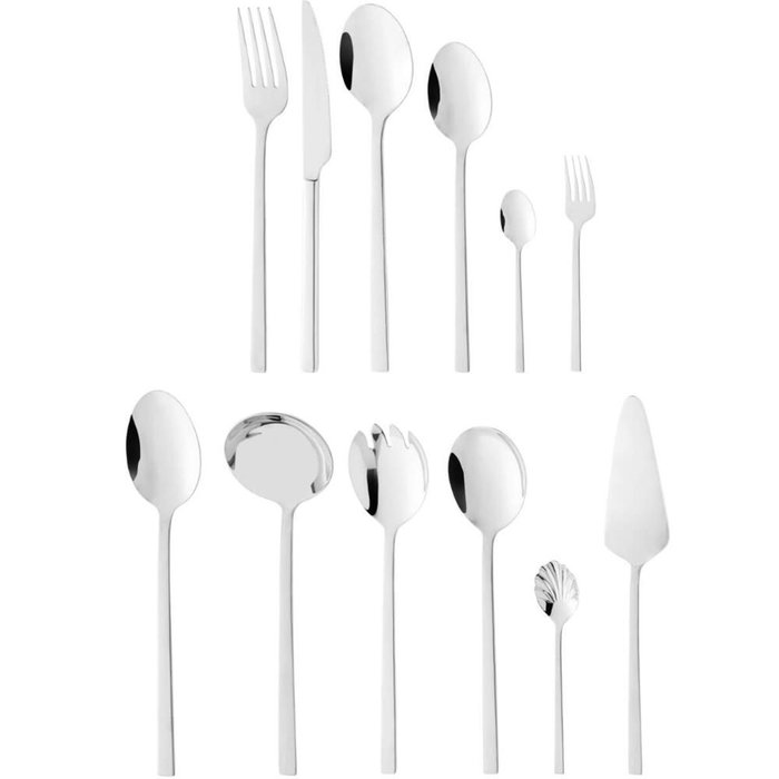 Conteúdo: 8 facas, 8 colheres e 8 garfos de mesa, 8 garfos e 8 colheres de sobremesa, 8 colheres de café, 1 concha, 1 colher de servir, 1 colher e 1 garfo de salada, 1 colher de açúcar e 1 espátula.