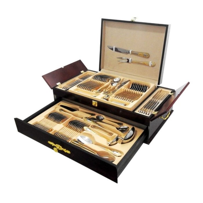 Cheio de estilo com requinte de detalhes no acabamento filetado a ouro este faqueiro de inox de altíssima qualidade é uma ótima opção para compor sua mesa. O estojo em madeira permite que as peças sejam organizadas individualmente, garantindo assim que os talheres estejam sempre separados e prontos para mostrar o seu bom gosto como anfitrião.