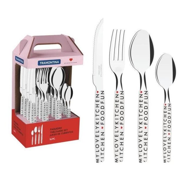 Faqueiro My Lovely Kitchen 16 Peças Inox Tramontina Descrição: Se você preza por itens que transmitam delicadeza e tornem sua mesa muito mais agradável, o Faqueiro Tramontina My Lovely Kitchen com Lâminas em Aço Inox e Cabos de Polipropileno Rosa 16 Peças é a escolha ideal! Suas peças são adequadas para utilização no dia a dia, pois são produzidas com lâminas em aço inox e cabos de polipropileno com tampografia na parte superior do cabo, ambas características que as tornam resistentes e duráveis. A decoração do jogo é muito especial e vai auxiliar você a levar muito mais estilo para sua mesa e rotina! Lâminas de aço inox.