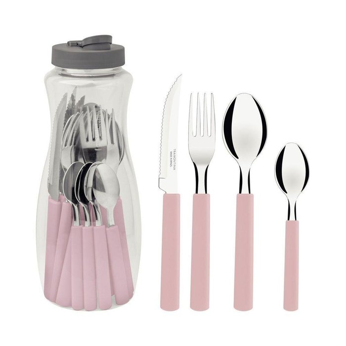 Faqueiro Tramontina Gamboa com Lâminas em Aço Inox e Cabos de Polipropileno Rosa 16 PeçasO faqueiro Tramontina Gamboa com lâminas em aço inox e cabos de polipropileno rosa 16 peças é indispensável para você que adora mesa posta e não abre mão do estilo em suas refeições. Ele tem suas peças desenvolvidas com lâminas de aço inox e cabos de polipropileno, conferindo resistência, durabilidade e conforto no manuseio, assegurando maior firmeza e segurança durante o uso. Composto por 16 peças, ele é ideal para atender suas exigências diárias, além de ser uma excelente escolha para recepcionar convidados em grande estilo ou aproveitar com a família em uma refeição do dia a dia. O faqueiro ainda pode ser lavado na lava-louças, proporcionando mair praticidade e otimizando seu tempo na cozinha. Sua mesa será elevada a um novo patamar de beleza e sofisticação com a presença do faqueiro Tramontina Gamboa! Squeeze: Ideal para servir, em caso de transporte de líquidos em bolsa ou mochila, vazamentos poderão ocorrer.Lâminas de aço inox. As lâminas das facas têm maior durabilidade do fio devido ao tratamento térmico. Os garfos e colheres garantem maior resistência devido a espessura do aço e a estampagem das lâminas. Os cabos de polipropileno possuem maior resistência e durabilidade. Podem ir à máquina de lavar louças facilitando seu dia a dia.Cuidados com o produto Antes de usar, remova a proteção plástica presente no interior do squeeze.Antes da primeira utilização, lave bem as peças e seque-as.Tenha cuidado ao manusear produtos cortantes e perfurantes e mantenha-os fora do alcance das crianças.Para maior durabilidade dos produtos recomenda-se secar bem antes de guardar, mesmo após lavagem em lava-louças.Para descarte dos produtos e embalagem siga as orientações de reciclagem vigentes.Garantia90 dias para vícios ou defeitos de fabricação