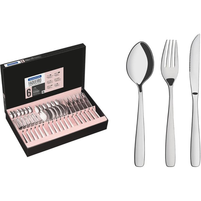 Para deixar as refeições ainda mais elegantes, o ambiente da cozinha mais moderno e ainda mantendo a funcionalidade, a Linha Amazonas chegou. Com um Faqueiro feito inteiramente em aço inox e acabamento em alto brilho, os talheres deste jogo irão te surpreender. Para um manuseio mais seguro, as bordas dos talheres são arredondadas e polidas. Ideal para uma refeição em até 6 pessoas, garanta um ótimo momento em família, inclusive nos dias com churrasco, afinal o faqueiro contém facas de churrasco. Mas não se preocupe caso utilize utensílios de porcelana, pois os serrilhados das facas são temperados e impedem que risque. Isso tudo só mostra toda a funcionalidade deste item, que carrega sempre a qualidade tão conhecida da Tramontina. Características: Marca: Tramontina Código do Fabricante: 66960134 Linha: Amazonas Cor: Inox Material: Aço inox Aplicação: Mesa/Churrasco Conteúdo: 6 Colheres de Mesa, 6 Colheres para Café, 6 Colheres para Chá, 6 Facas para Churrasco, 6 Garfos de Mesa e 6 Garfos para Torta Compatível com Lava-louças: Sim (retirar quando terminar o ciclo ''enxaguar'' para secagem manual)