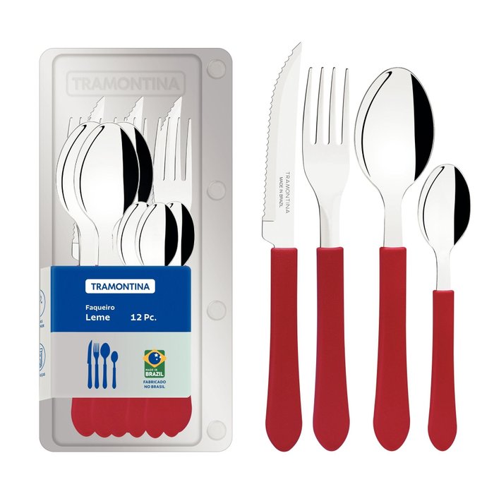 Para você compor uma mesa cheia de charme para suas refeições, precisa contar com talheres de qualidade. Por isso, o faqueiro Tramontina Leme com lâminas em aço inox e cabos de polipropileno vermelho 12 peças é uma escolha excelente. Eles são perfeitos para lhe acompanhar diariamente, seja com um filé à parmegiana, uma sopa de capeletti e uma macarronada para toda a famÃlia. Suas peças contam com lâminas produzidas em aço inox e cabos de polipropileno na cor vermelha, onde as facas contam com tratamento térmico e os garfos e colheres tem estampagem e espessura especial do aço, que garantem excelente durabilidade e alta resistência. Um jogo perfeito para quem não abre mão da praticidade e da beleza no seu dia a dia!