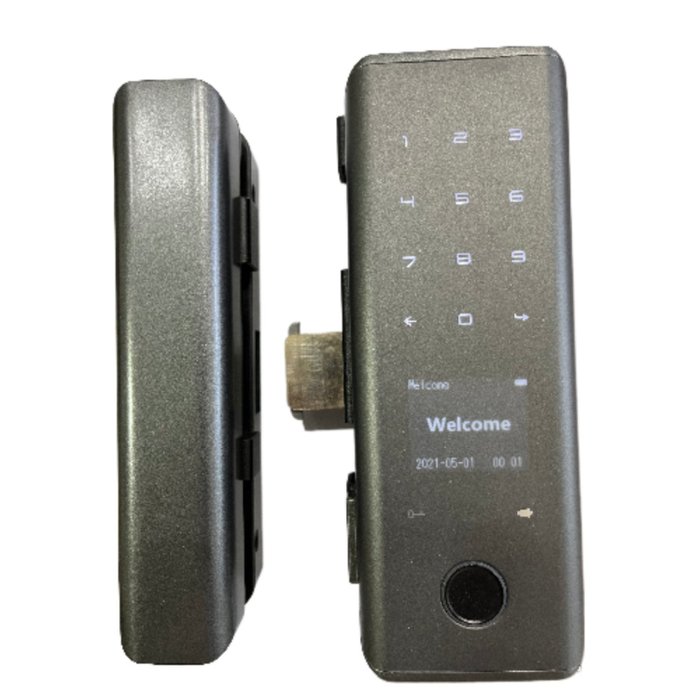 Fechadura Digital com conectividade Wi-Fi, para portas de painéis de vidro com espessura de 10 a 12mm, abertura por aplicativo Tuya Smart instalado no celular, biometria com capacidade de até 100 usuários, senha numérica de 6 a 10 dígitos com capacidade de até 100 usuários, cartão de aproximação com capacidade de até 100 usuários (acompanham 2 cartões), chave física (acompanham 2 chaves), exclusive fecho com bico de papagaio, apropriado para utilização em portas de abrir ou de correr