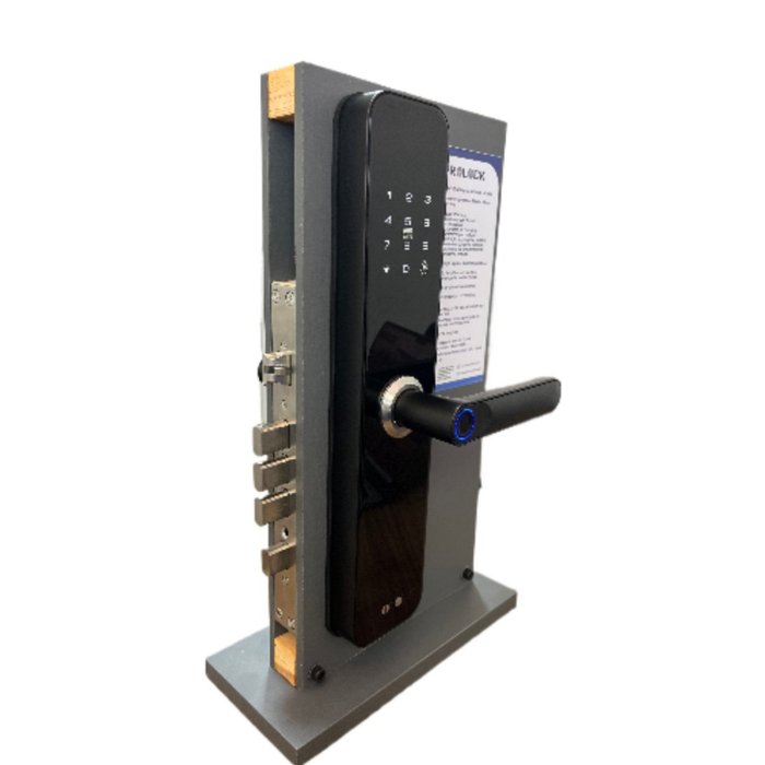 Fechadura Digital com conectividade Wi-Fi, para portas com espessura entre 40 e 80mm, máquina reforçada com 3 linguetas adicionais para maior segurança, abertura por aplicativo Tuya Smart instalado no celular, biometria com capacidade de até 100 usuários, senha numérica de 6 a 10 dígitos com capacidade de até 100 usuários, cartão de aproximação com capacidade de até 100 usuários (acompanham 2 cartões), chave física (acompanham 2 chaves),