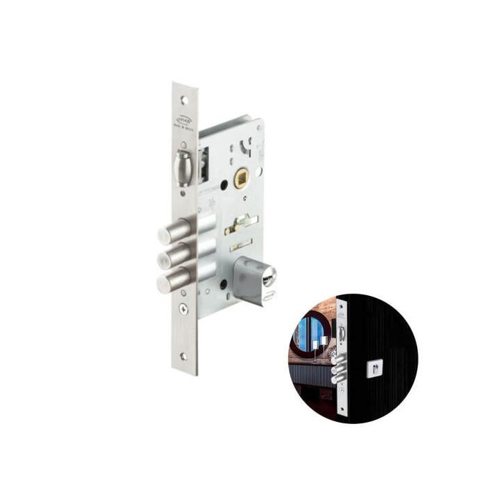 Utilização para portas pivotantes ou de passagem, permite a abertura e fechamento da porta, sem acionamento da maçaneta, contratesta em latão bipartida que permite montagem para portas direitas ou esquerdas. A lingueta e o trinco tem acabamento cromado para maiores durabilidades. A chapa testa e a contratesta, em acabamento a,s e cr.