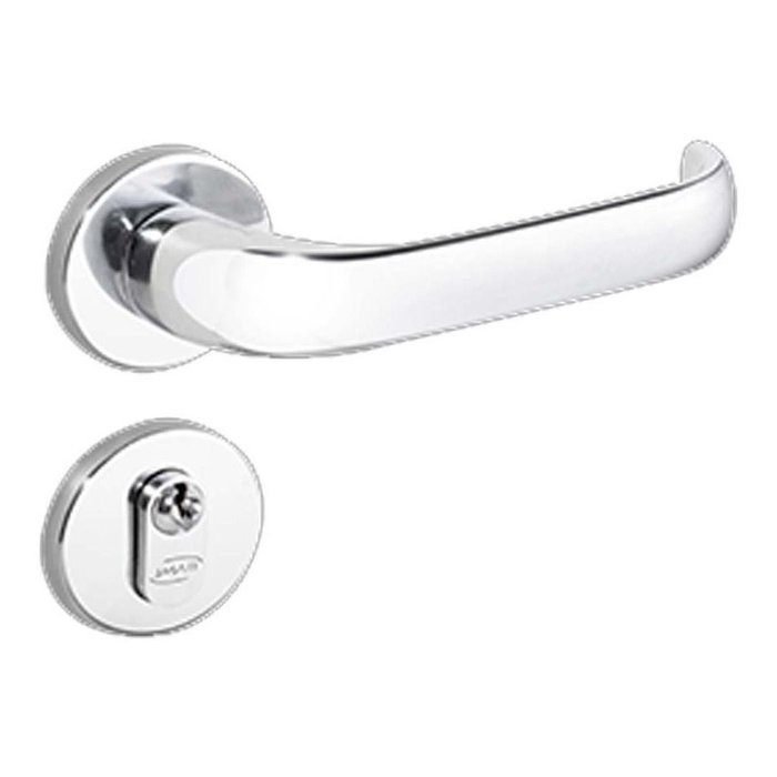 CONJUNTO DE FECHADURA DA LINHA BASIC DO MODELO DUNA MA0987, MATERIAL EM ZAMAK NO ACABAMENTO CROMADO E ACETINADO, COMPOSTO DE ROSETA - 0069 EM ACO INOX, FECHADURA 1300 EXTERNA COM DISTÂNCIA BROCA 40 MM TIPO I, CLASSIFICADO CONFORME NORMA ABNT NBR 14913: 2- TRÁFEGO MÉDIO, 2- SEGURANÇA MÉDIA, 2- COM UMIDADES, SEM INTEMPÉRIES.