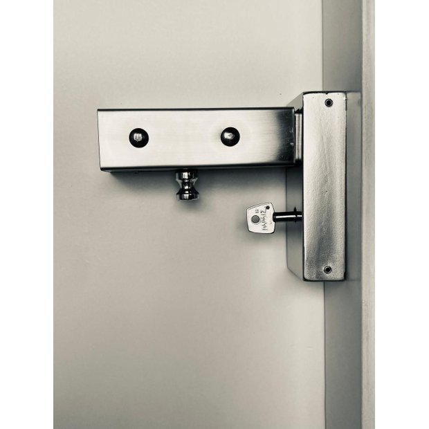 Tranca Barra Lateral com travamento na lateral da porta, instalação no lado externo da porta com abertura para dentro, contratesta reforçada com parafusos longos de 60mm, chaveamento só no lado externo da porta, 1 fechadura embutida e protegida por estrutura tubular de aço, acabamento galvanizado com pintura pó eletrostática, cor branco.