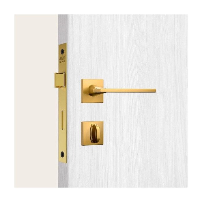 Fechadura Residencial Stam, modelo Classic Antares 3000, com Roseta Quadrada Gold Dourado, distância de broca 40mm, para Porta de Madeira de Banheiro.