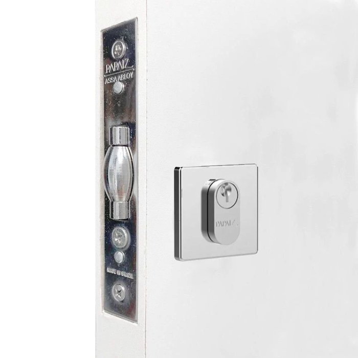 Fechadura Trava Rolete 3780 Externa R202 Cromo Acetinado Roseta Quadrada 45mm Blister cilindro 200/60 Papaiz