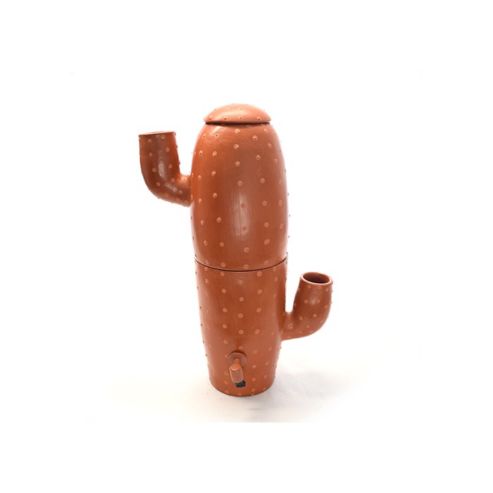 A criatividade da artesã Adriana conseguiu transformar a tradição do barro no Vale do Jequitinhonha em um belíssimo filtro, em formato de cacto. A pintura é totalmente natural, feita com a tintura do próprio barro, chamada de engobe. Cada filtro suporta até 3L de água filtrada na parte inferior. É importante destacar que, em contato com a água, a peça pode escurecer levemente. A cerâmica ?transpira?, pois mantém a temperatura da água inferior à do ambiente externo, ou seja, sempre fresquinha. Também pode ocorrer o vazamento de um pouco d'água no início do uso, até o barro se condensar por completo. Nos espaços laterais podem ser colocadas plantinhas, pois eles não possuem ligação com o espaço da água.