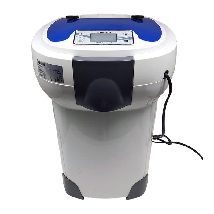 Filtro Canister Sunsun HW-3000 com frequência variável com visor digital para facilitar a regulagem, possui 6 engrenagens de saída ajustável, horário de trabalho do UV ajustável e 4 compartimentos para mídia.