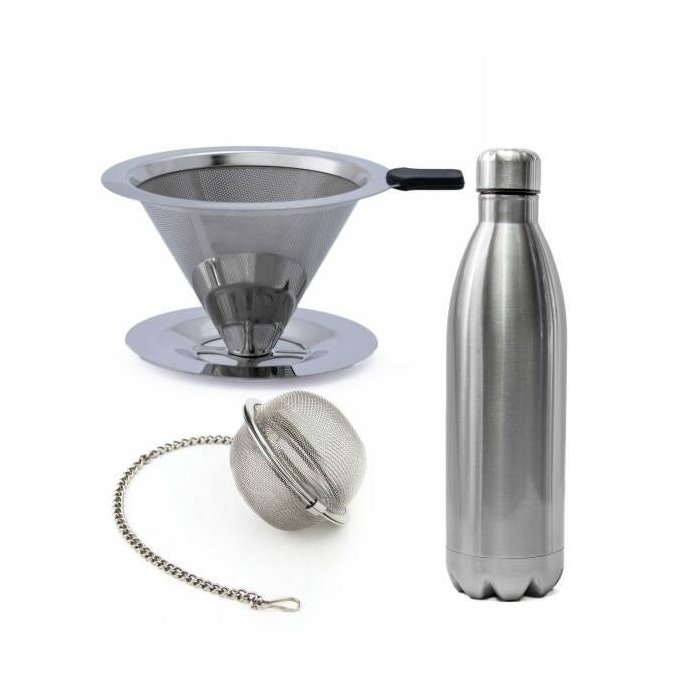 É composto por um Filtro Coador de Café de Aço Inox Premium 102 o qual dá a possibilidade de preparar o seu café em casa, ou quando em viagens, de forma prática, econômica e sustentável, sem a necessidade de filtros de papel e um infusor de chá de inox que permite com que você utilize folhas soltas ou granuladas para fazer um chá natural e delicioso sem o uso de descartáveis. Esta é uma garrafa térmica portátil 1 litro feita de aço inoxidável de camada dupla, resistente a ferrugem e durável por anos de uso diário. A isolação dupla da parede a vácuo conserva a temperatura do líquido na garrafa.