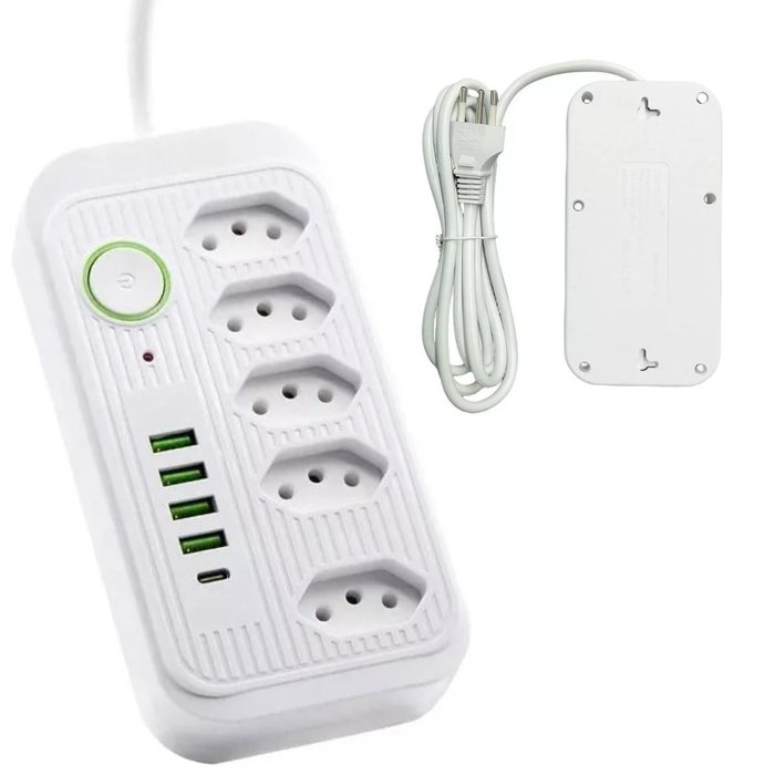 o cabo de 2 metros facilita a movimentação, enquanto a capacidade multicargas permite que você conecte até 10 utensílios simultaneamente, eliminando a espera por dispositivos individuais. As 5 tomadas padrão br, 4 cabos usb e 1 cabo tipo c. Oferecem versatilidade máxima.