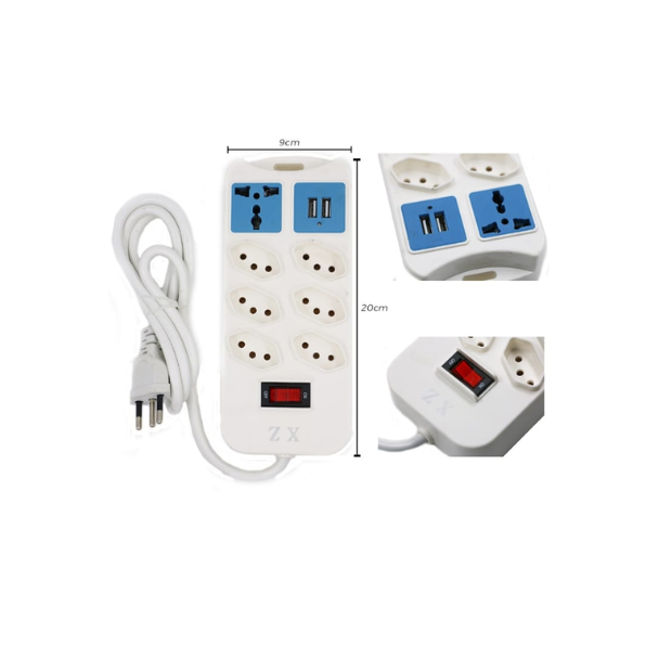 Filtro de linha com 6 tomadas padrão Brasil, 2 entradas USB e 1 tomada universal.